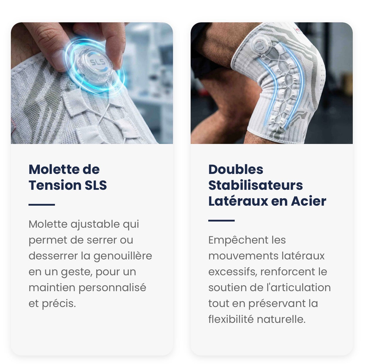 Ses doubles stabilisateurs en acier empêchent les mouvements latéraux qui aggravent votre douleur. Résultat : l'articulation est maintenue dans son alignement naturel, la pression est réduite immédiatement et la récupération est accélérée, que ce soit après une blessure, une intervention chirurgicale ou simplement des années d'usure.