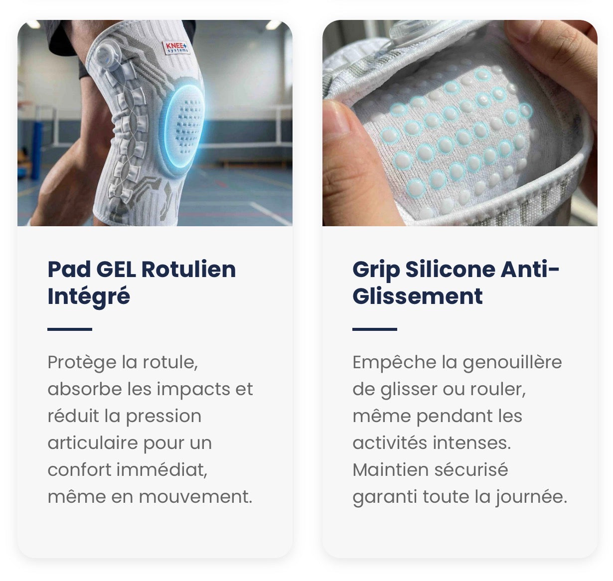 Non. La bande silicone anti-glissement maintient la genouillère en place, même pendant les entraînements intenses. Contrairement aux genouillères classiques qui nécessitent un réajustement permanent, le Stabilix Pro™ reste en place sans frottement ni inconfort.