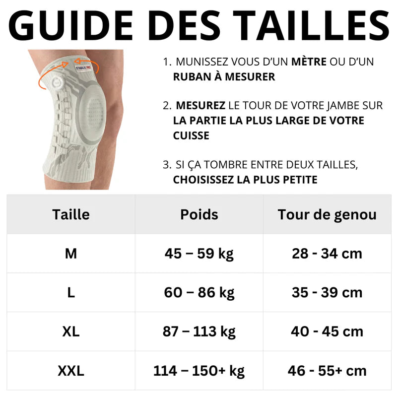 Obtenez un ruban à mesurer, mesurez autour de votre genou à son point le plus large et consultez le tableau des tailles pour trouver l'ajustement qui vous donnera le meilleur soutien.